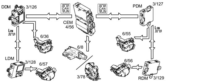 Contact breaker for central locking motor indication, and consequently contact breaker for child-proof lock motor, for the rear doors, are connected to their respective rear control module. The rear door control modules transmit the signal on to the relevant control module in the front doors which forward the signal to the central electronic module (CEM).