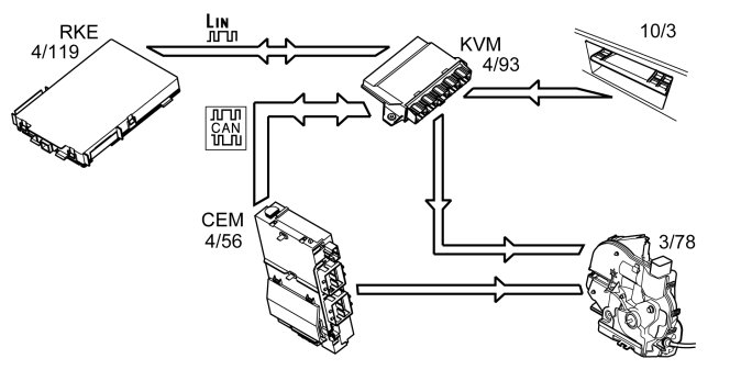 Note! The market in Japan has Remote Keyless Entry (RKE) regardless of if the vehicle is equipped with keyless entry system or not. When the vehicle is not equipped with keyless entry system, the Remote Keyless Entry (RKE) communicates directly with Central electronic module (CEM). If the vehicle is equipped with keyless entry system, the Remote Keyless Entry (RKE) communicates via Keyless Vehicle Module (KVM).