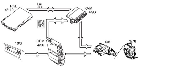 The vehicle is locked using the lock buttons on the door handles. During locking, the antenna is also activated to check that there is an authorized remote key in the vicinity of the vehicle. If the remote key is approved, the keyless vehicle module (KVM) transmits a signal to the central electronic module (CEM) to lock the vehicle.