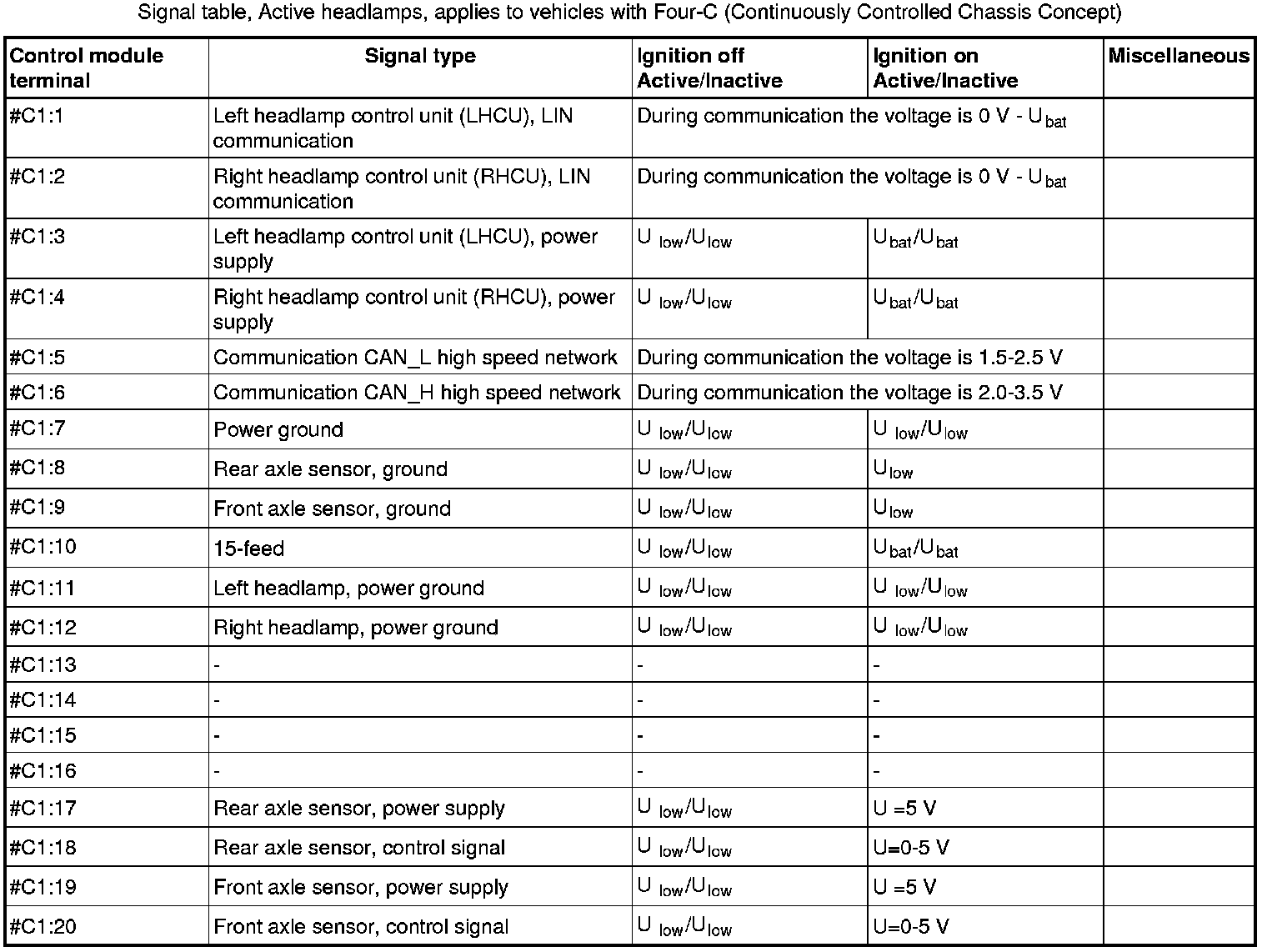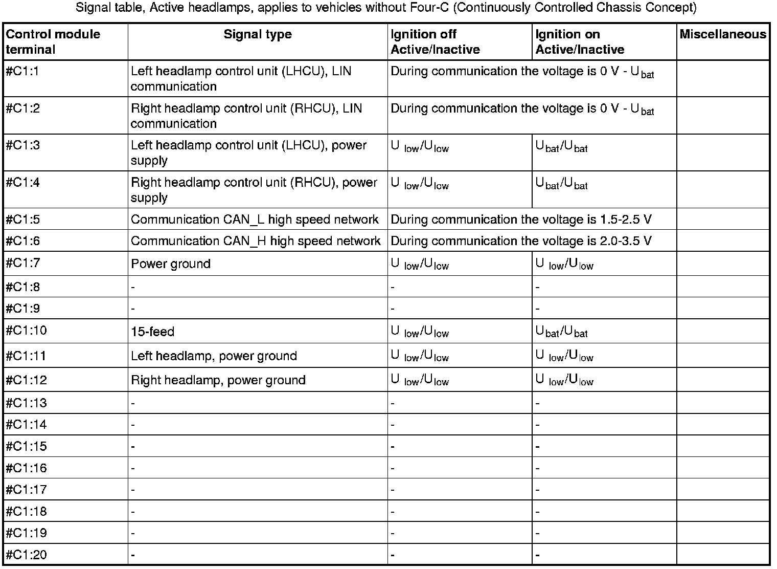 All the values given below are between the respective terminal in column 1 and terminal # C1:7 in column 1 (power ground) unless otherwise stated in brackets.
