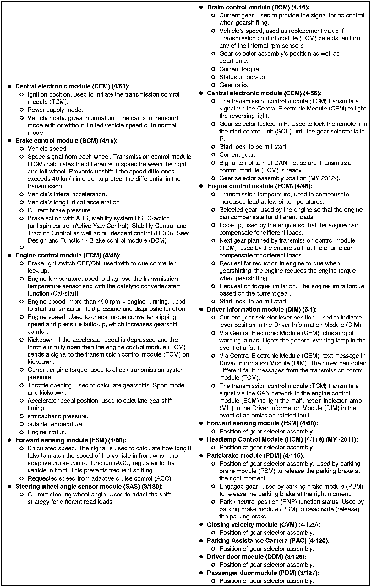 The table below summarizes the input and output signals to and from the transmission control module (TCM). The signal types are divided into directly connected signals, serial communication and CAN communication. The illustration below displays the same information with Volvo component designations.