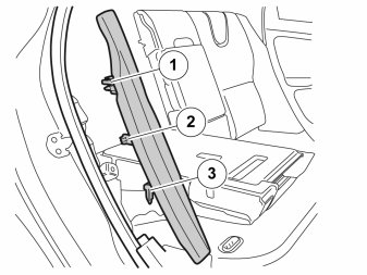 - Remove the left side cushion by pulling the upper edge backwards until the hooks (1) release. Then pull the cushion inwards slightly so that the hook (2) releases and then pull upwards until the locating pin (3) unhooks from the mounting at the lower edge.