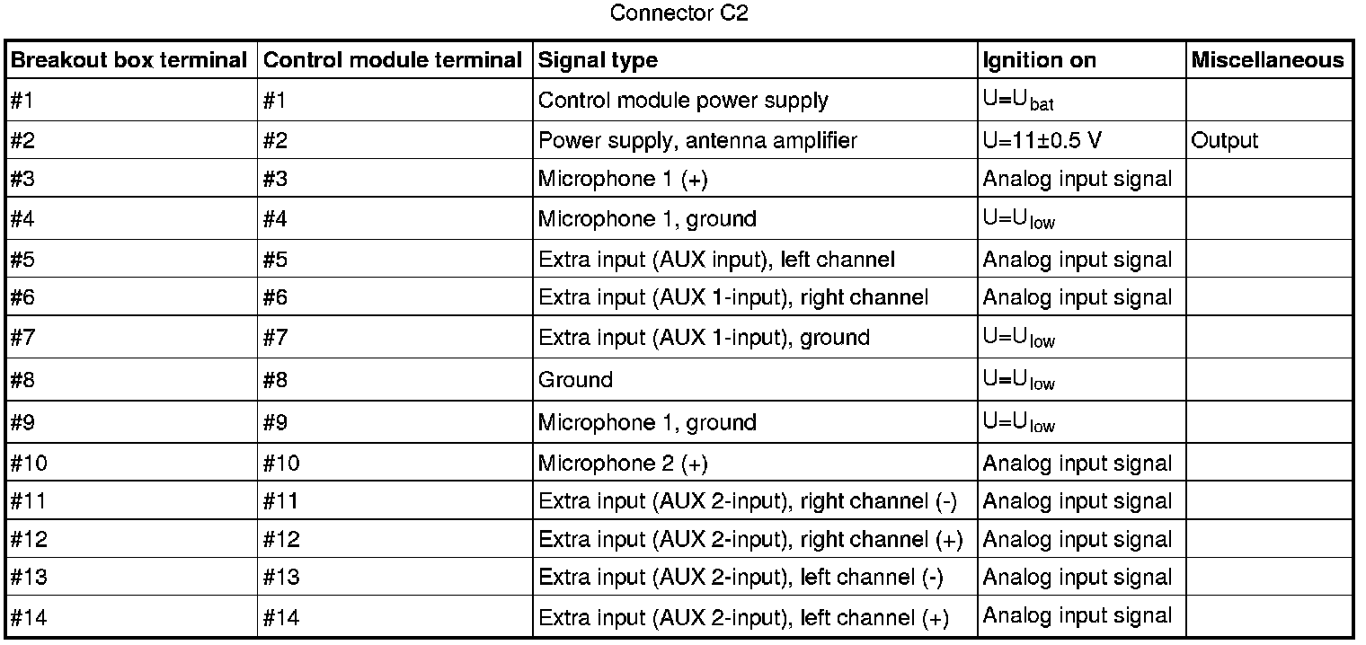 All values below are measured between the relevant terminal in column 1 and C2-8 in column 2 (power ground) unless otherwise stated in parenthesis after the table entry.