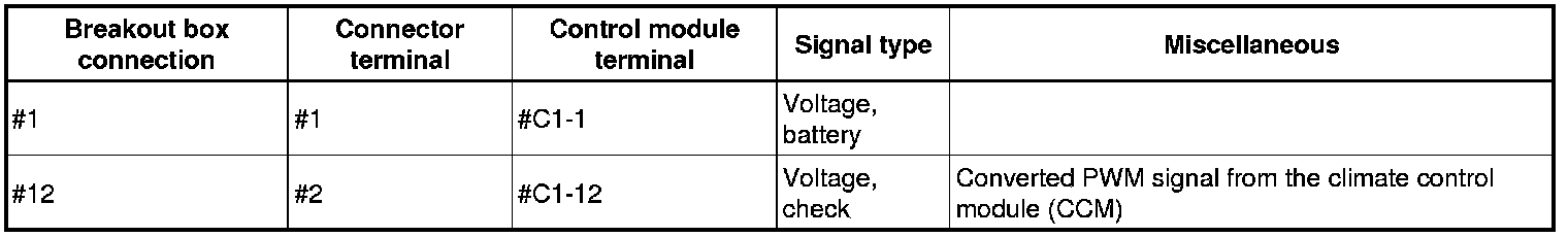 The fan motor is supplied by a PWM signal from the climate control module (CCM) via the fan's control module. The control module ensures that the fan motor receives the correct voltage in reference to battery voltage and that the fan thereby obtains the desired speed.