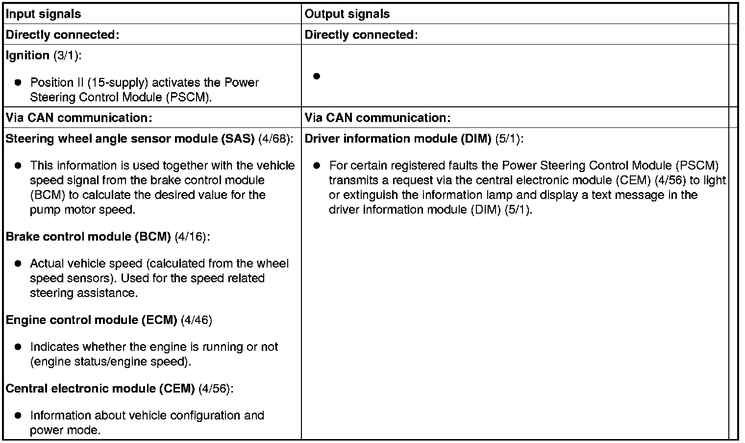 The table below summarizes the input signals to and output signals from the Power Steering Control Module (PSCM). The signal types are divided into directly connected signals and CAN communication. The illustration below displays the same information with the Volvo component designations.