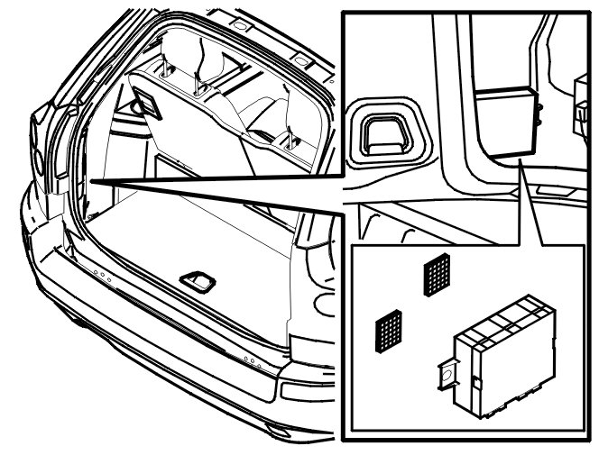 Fold up the cargo compartment floor and remove the corner piece (1) of the floor on the left-hand side. See the illustration.