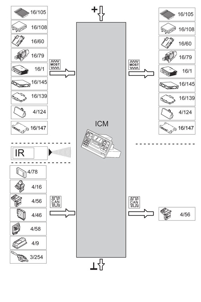 The infotainment control module (ICM) acts as a gateway between the CAN and MOST network. It also acts as the master control module in the MOST network and checks the other control modules.