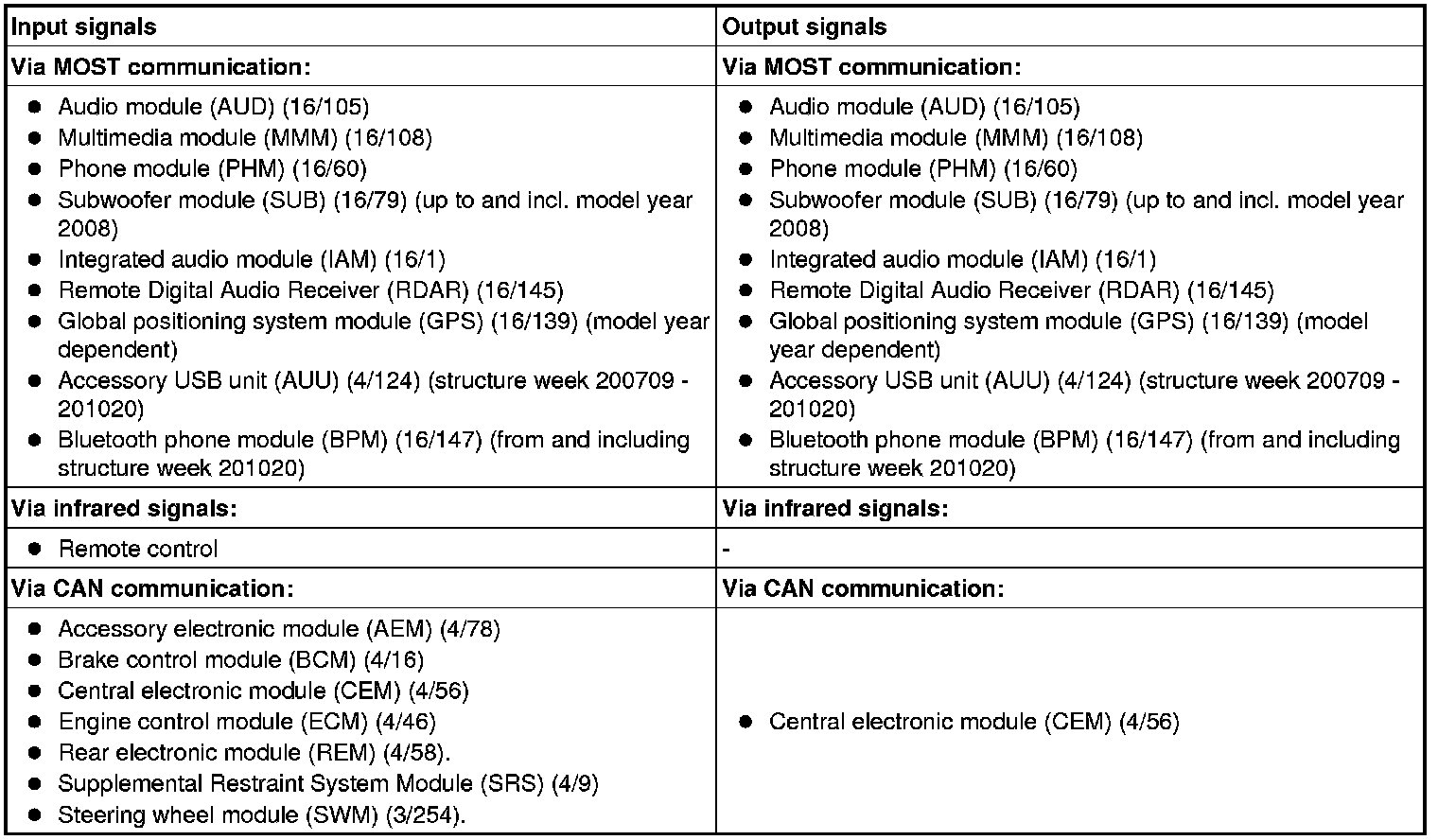 The table below summarizes the input signals to and output signals from the Infotainment control module (ICM). The signal types are divided into infra-red signals (IR), MOST communication and controller area network (CAN) communication. The illustration below displays the same information with the Volvo component designations.