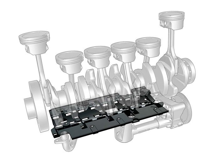 The oil pan is designed to reduce mechanical noise from the engine, at the same time as providing a reliable supply of oil at different angles. A composite oil scraper keeps the larger section of the oil volume away from the rotating crankshaft. It minimizes power loss, improves fuel economy and prevents the oil from foaming.