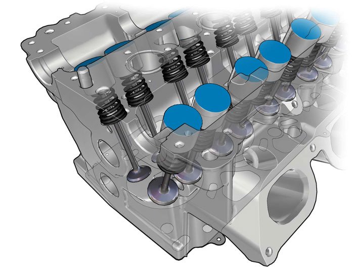 The two camshafts are supported by seven bearing caps each, directly in the cylinder head and camshaft cover. The camshaft cover works like a combined valve cover and camshaft bearing cap. The camshaft cover has cast oil ducts on the underneath which ensure good oil supply to the camshafts and the valve lifters.