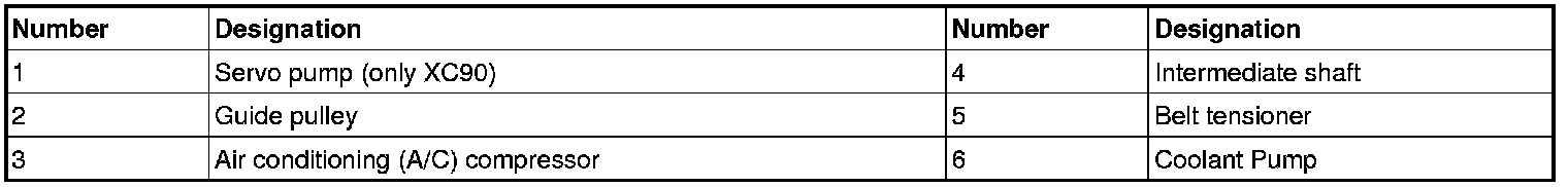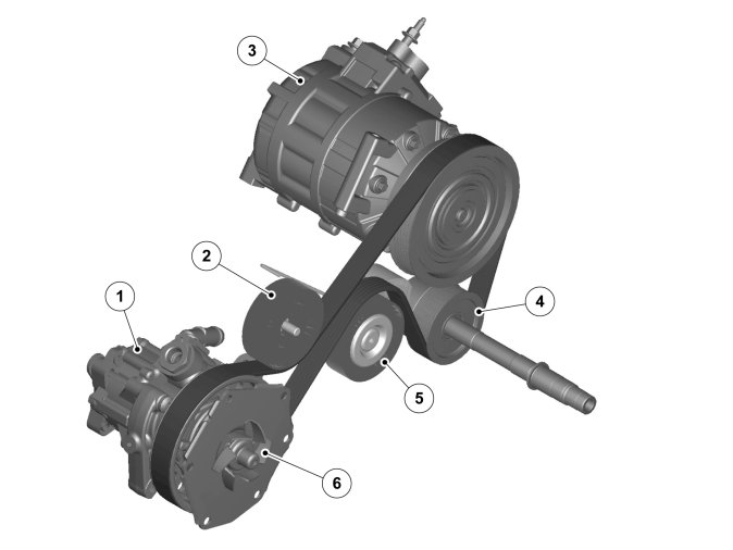 The belt system consists of a 6-ribbed Poly-V belt, an automatic belt tensioner and a guide pulley. This system drives the servo pump and AC compressor. The coolant pump is driven by the servo pump via the clutch system.