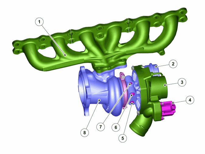 The exhaust gases enter via the manifold (1) down to the turbine housing (8) and out to the exhaust system via a downpipe and catalytic converter.