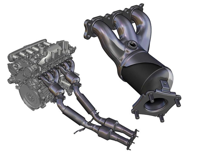Exhaust manifold/ CCC ( Close Coupled Catalyst) and front exhaust pipe/catalytic converter for engine are improved with regards to weight and efficiency. Heat shield plates are modified.