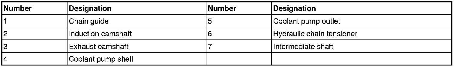 Both camshafts are driven by a camshaft chain, which in turn is driven by the crankshaft via the intermediate shaft. The camshaft chain has inverted teeth, so called, "silent chain".