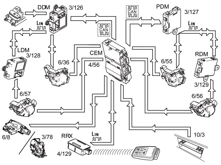 Note! Up to and including 09w21:The market in Japan has remote keyless entry (RKE), regardless whether the vehicle is equipped with keyless entry system or not. If the vehicle is not equipped with keyless entry system, remote keyless entry (RKE) communicates directly with Central electronic module (CEM). If the vehicle is equipped with keyless entry system, remote keyless entry (RKE) communicates via the Keyless Vehicle Module (KVM). From and including 09w22: If the vehicle is not equipped with the keyless entry system the remote receiver module (RRX) communicates directly with the Central electronic module (CEM). If the vehicle is equipped with the keyless entry system, the remote keyless entry (RKE) communicates via the Keyless vehicle module (KVM).
