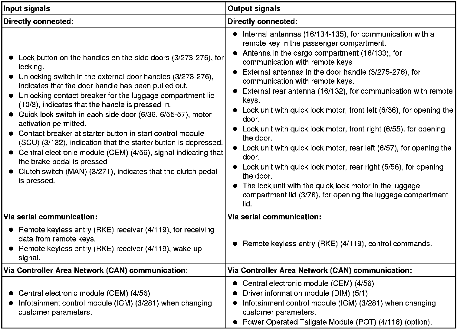 The table below summarizes the input signals to and output signals from the keyless vehicle module (KVM). The signal types are divided into directly connected signals, serial communication and controller area network (CAN) communication. The illustration below displays the same information with the Volvo component designations.