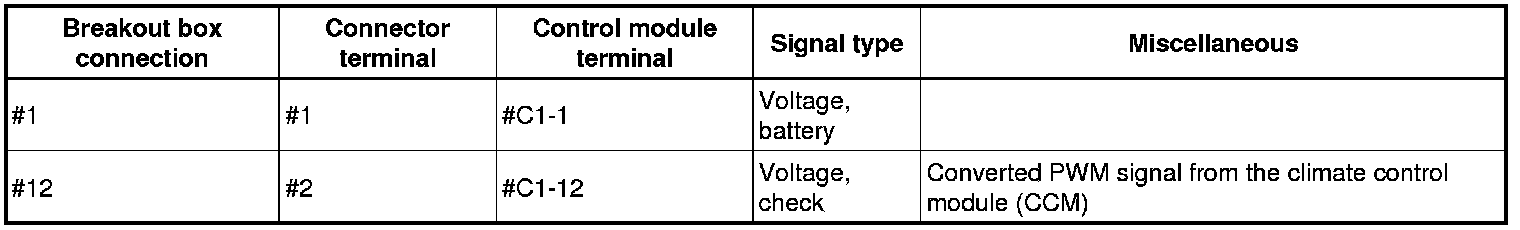 The fan motor is supplied by a PWM signal from the climate control module (CCM) via the fan's control module. The control module ensures that the fan motor receives the correct voltage in reference to battery voltage and that the fan thereby obtains the desired speed.