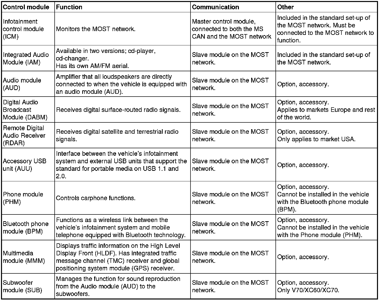 The infotainment control module (ICM) deals with monitoring and communication on the MOST network. The infotainment control module (ICM) is in turn monitored by the central electronic module (CEM) on the CAN network.