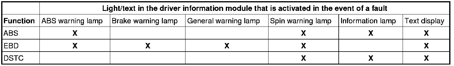 If the control module detects a fault, it stores a diagnostic trouble code in its internal memory. A number of values that were frozen at the time the fault occurred are stored at the same time. Depending on the severity of the fault, certain functions may be partially or completely disengaged. A warning lamp lights in the driver information module (DIM) to inform the driver that a fault has occurred. A warning or information text will also be shown in the display in the driver information module (DIM). The text displayed is determined by the type of fault (see the table). Diagnostic trouble codes and frozen values can be read off using the diagnostic tool via the data link connector in the vehicle.