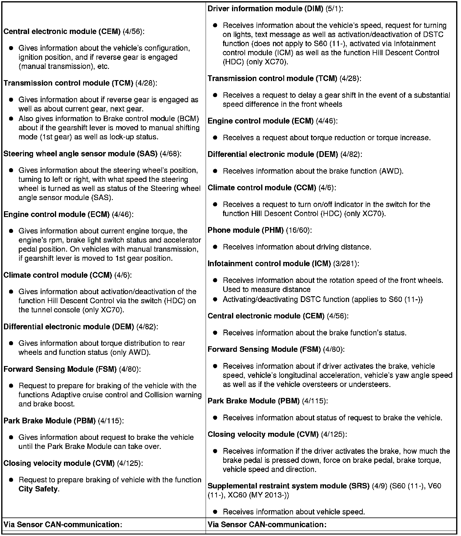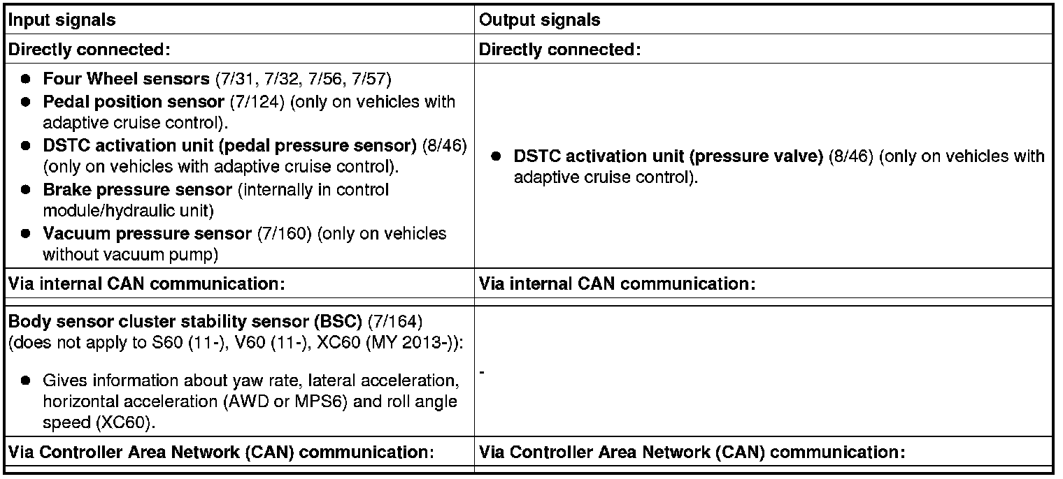 The table below summarizes the input signals to and output signals from the brake control module (BCM). The signal types are divided into directly connected signals, serial communication and CAN communication. The illustration below displays the same information with the Volvo component designations.