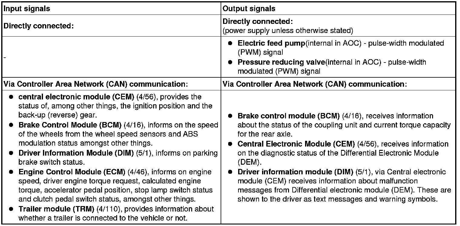 The table below summarizes input and output signals to and from the Differential Electronic Module (DEM). The illustration below displays the same information with the Volvo component designations.