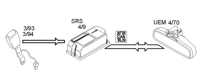 The seat belt reminder is activated when the upper electronic module (UEM) (4/70) receives a signal from the supplemental restraint system module (SRS) (4/9), via the controller area network (CAN), which indicates that the seat belt is not engaged despite someone sitting in the front seat.