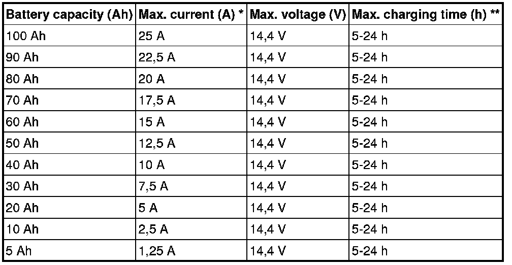 * Max. current is calculated with the following formula (Battery capacity Ah/20)*5. For example, for a battery with capacity 70 Ah: (70/20)*5= 17.5 A.