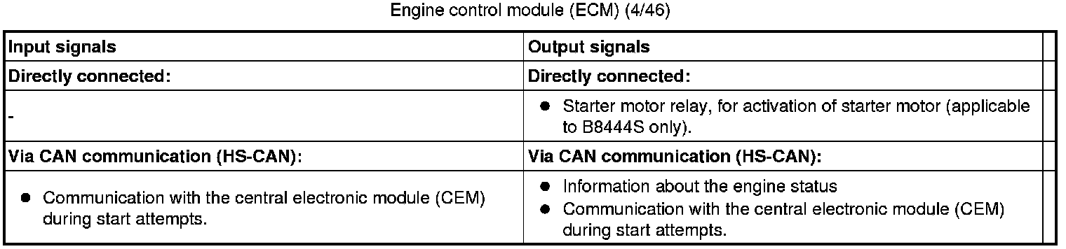The tables below summarize the input and output signals to the units in the system for the immobilizer. The signal types are divided into directly connected signals, serial communication and controller area network (CAN) communication.