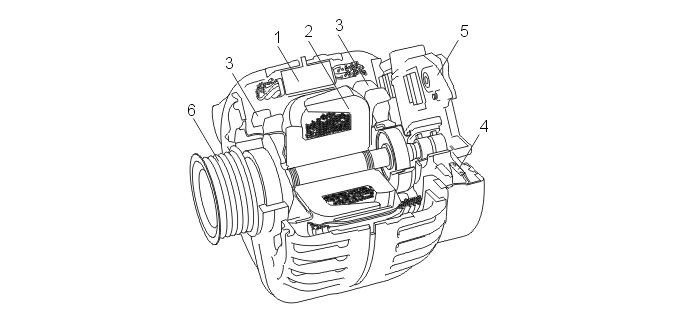 The generator (GEN) has an inbuilt charge regulator at the rear (also known as the alternator control module (ACM)). The regulator can be replaced. The carbon brushes are integrated on the slip rings on the rotor on the regulator.